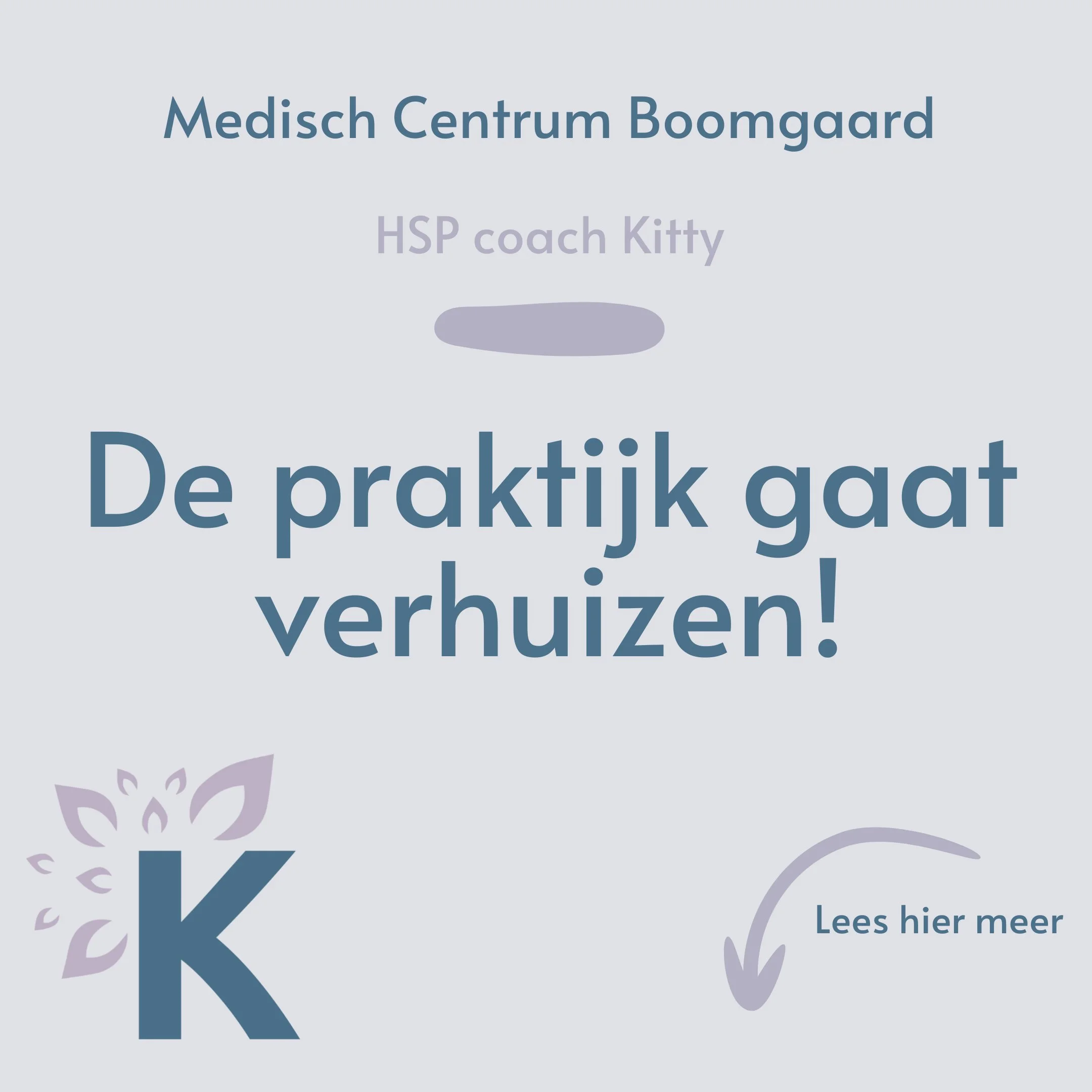 De praktijk gaat verhuizen! Vanaf 13 oktober verhuist Kitty - coach Hoogsensitiviteit (HSP) naar Boskoop. Daarmee neem ik de praktijkruimte in het Medisch Centrum Boomgaard van collega HSP coach Maaike over die de regio verlaat.